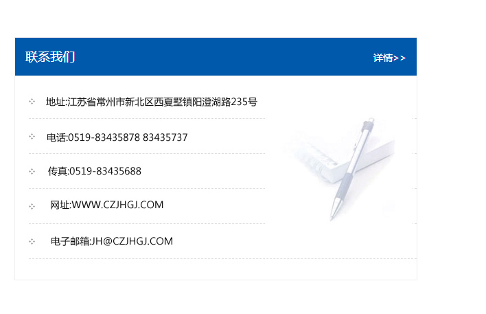 傳真:0519-83435688    郵編:213135    網址:WWW.czjhgj_com.hbsysg.com    電子郵箱:JH@czjhgj_com.hbsysg.com